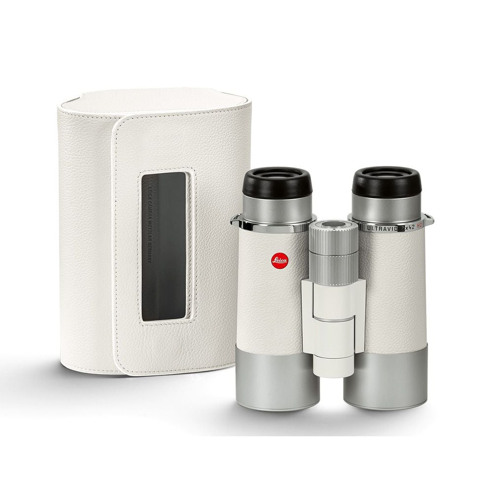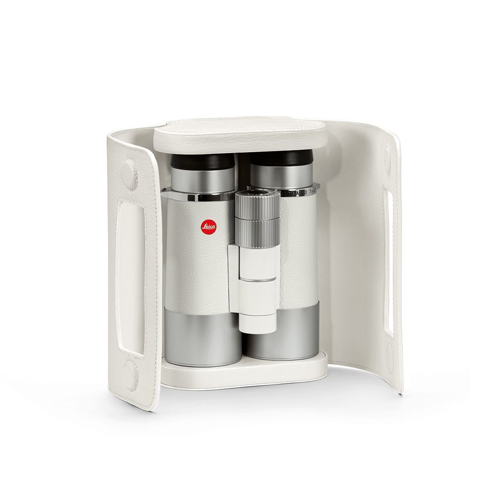 - Leica Ultravid 7×42 White Ocean, white leather carrying strap, white anti-slip leather pouch, lens cleaning cloth.