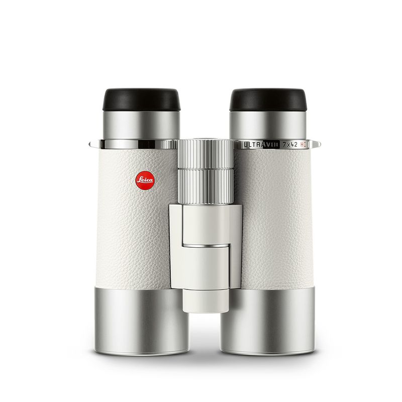 - Leica Ultravid 7×42 White Ocean, white leather carrying strap, white anti-slip leather pouch, lens cleaning cloth.