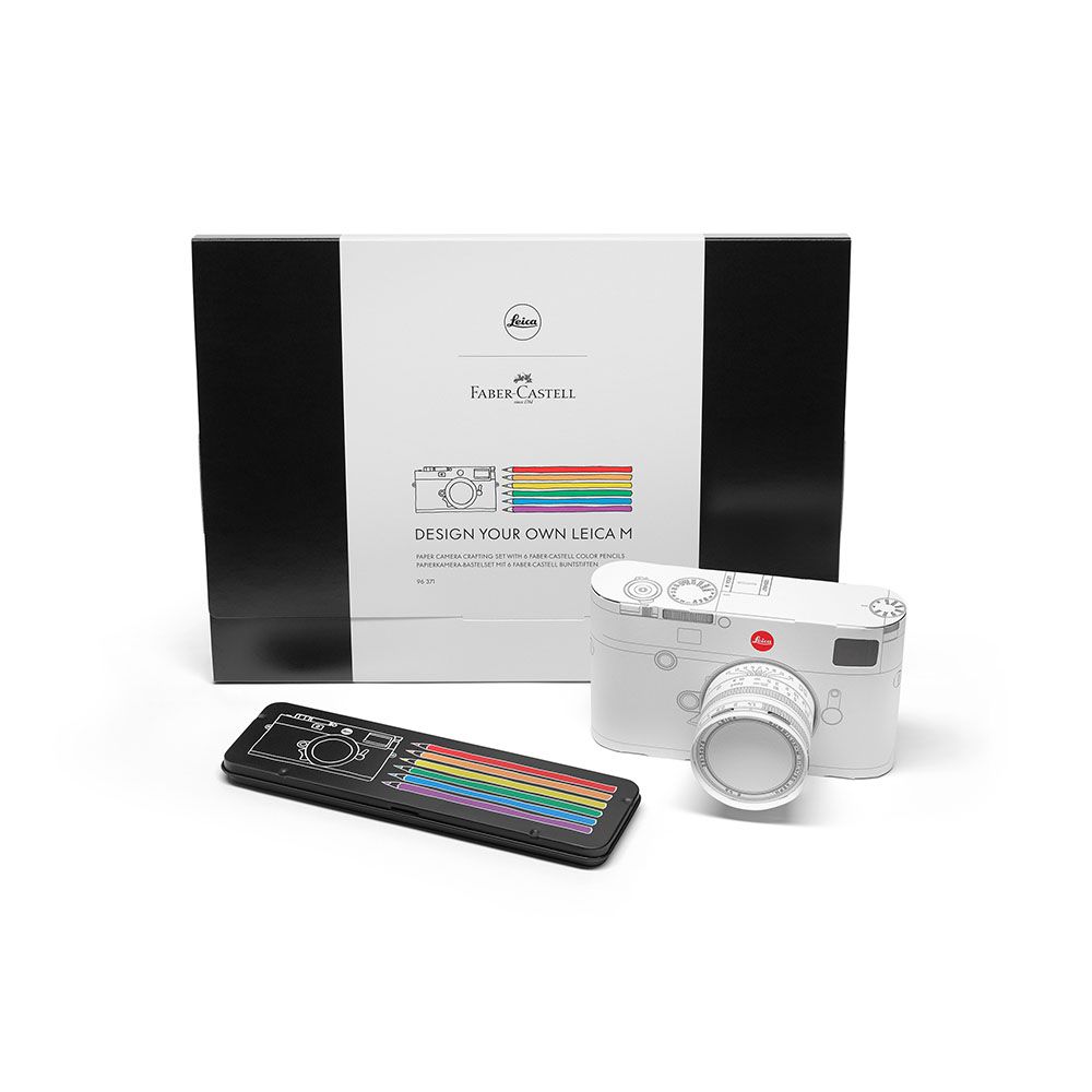 "This crafting set includes a paper cut-out sheet of the Leica M-Camera and a Faber-Castell pencil set featuring six colour pencils in a metal box. You can use it to build and personalise your very own Leica M model, adding vibrant colours with the pencils to bring your creation to life.